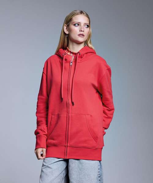 Shaped to fit. 320gsm. Peached fabric, soft-feel finish. Waffle knit hood. High polished, nickel free eyelets, zip and drawcord ends. Polyester dyed to match tubular drawcord. Concealed zip. Brushed fleece inner. Twin-needling detailing creates a high quality finish. Cut and sew two by one ribbed cuffs and hem. Kangaroo pouch pocket. Self-coloured neck size label.