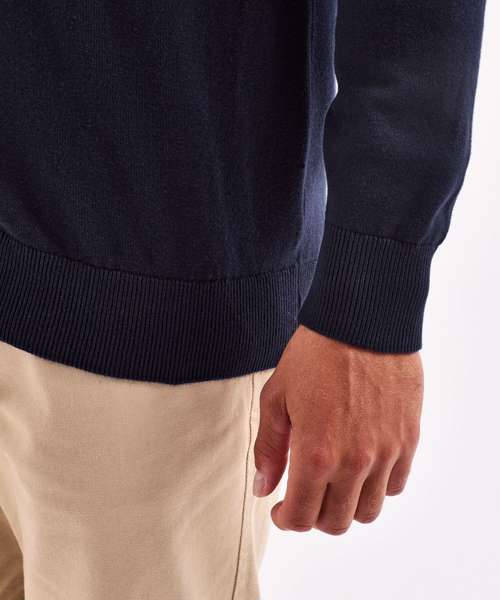 ¼ zip sweater. Decorative tuck stitching. Ribbed knit on the cuffs and hem. Product contains no branded neck label. Removable Kimble or looped garment tags. Inner seam label holds important product information on one label with a second label containing brand information which can be cut-away. Please note old stock may contain a fixed branded label.