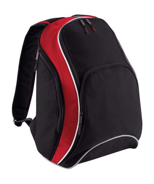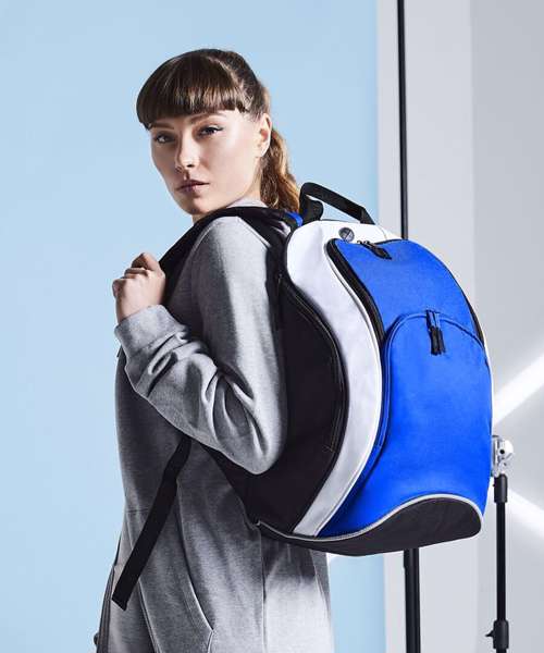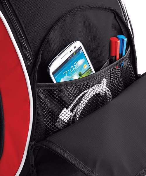 Padded adjustable shoulder straps. Enhanced visibility. Reflective piping. Zippered front pocket. Zippered side pockets. Internal mesh pocket. Water bottle pocket. Media pocket. Headphone port. Padded back panel.