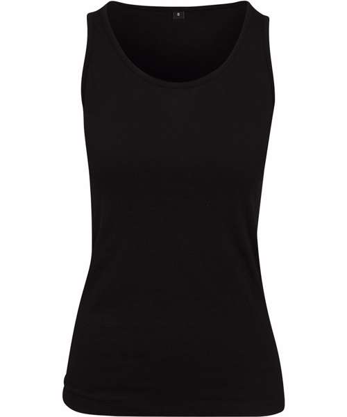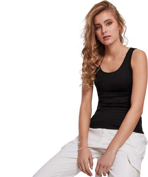 Tank top, sleeveless, low round neck, cuffs at hem, neckline and armholes.