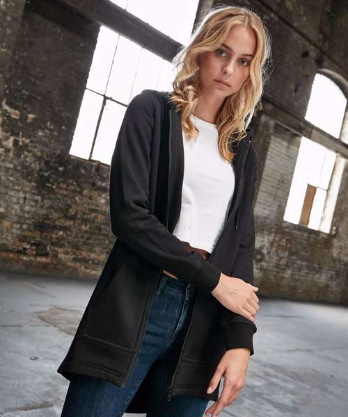 Comfortable basic zip-hoody for women in the style of a parka with extended back and hood. Great fit thanks to the drawstring hem and ribbed cuffs. The half-moon at the back neckline can easily be refined individually.