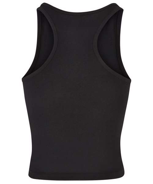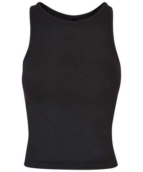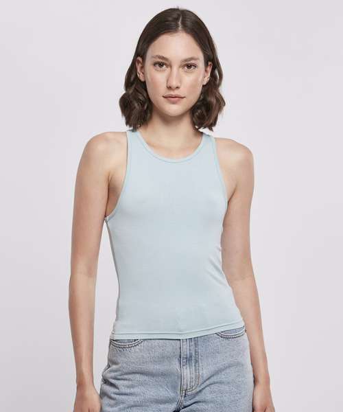 Equipped with a dynamic, sporty racerback cut, the otherwise plain, single-coloured women’s top sets a style statement. This women’s top offers a high crew neck on the front, while the cut is slim fit and the length is kept short. A pleasant wear is ensured by a material mix of cotton and elastane. The summery style can be individually refined further, either by flock or screen printing or with embroidery.