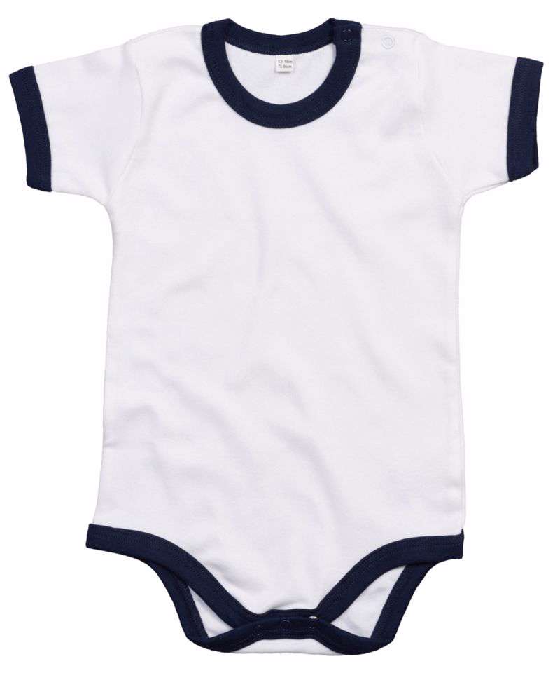 Super soft bodysuit with wide contrast binding at neck, arms and legs.