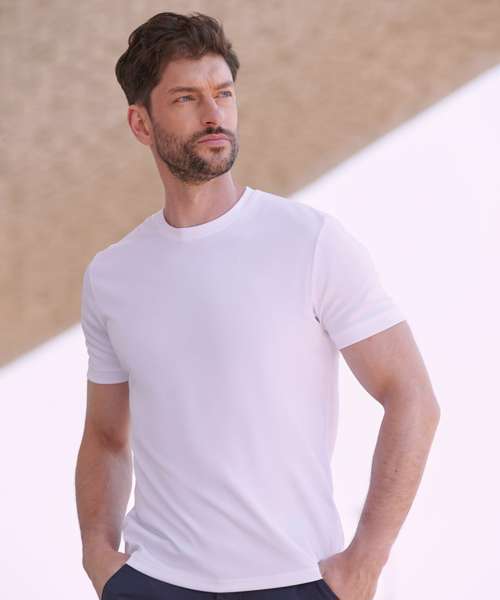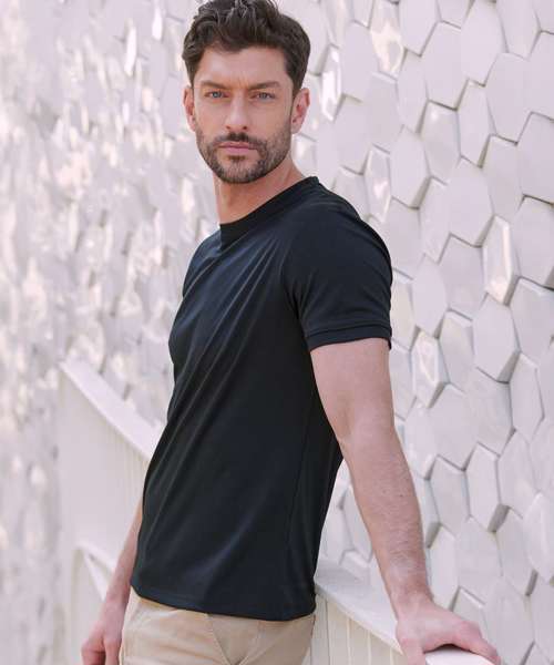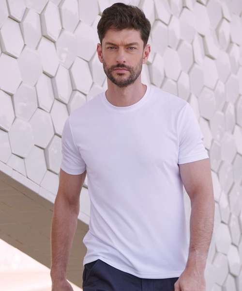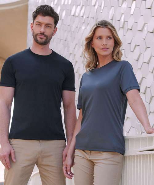 Go casual in a t-shirt that is on trend and will perform. The HiCool® permanent wicking yarn technology will keep you cool and fresh all day whilst looking on trend with its modern self-fabric neckline and cuffs.