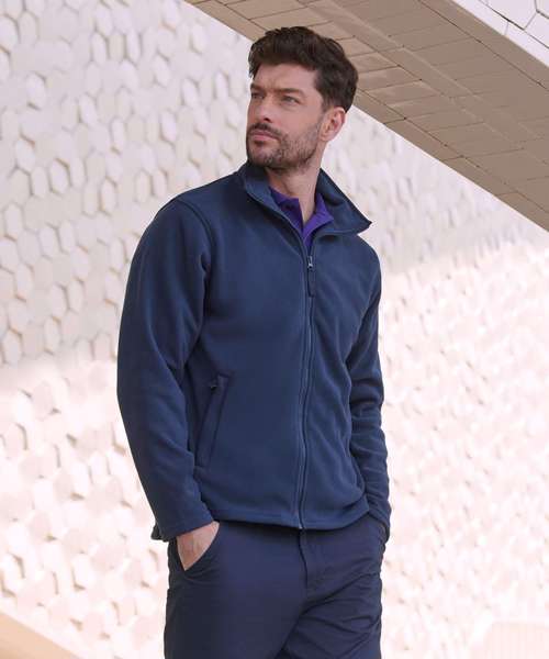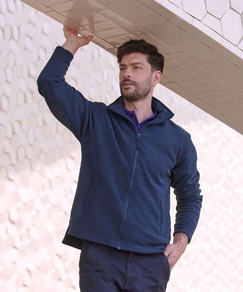 Polyester microfleece with anti-pill finish. Smooth surface for ease of decoration. Front zip pockets. Drop tail. Binding at neck edge. Side vents for ease of movement. Outer hanging loop. Soft stand collar.