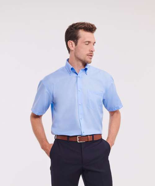 Made using the newest technologies of non-iron fabric that stays wrinkle free and keeps the wearer looking and feeling smart all day long. The classic gents shirt cut with semi-cut away button down collar and chest pocket. Back yoke with two pleats. Rounded hem.