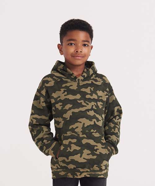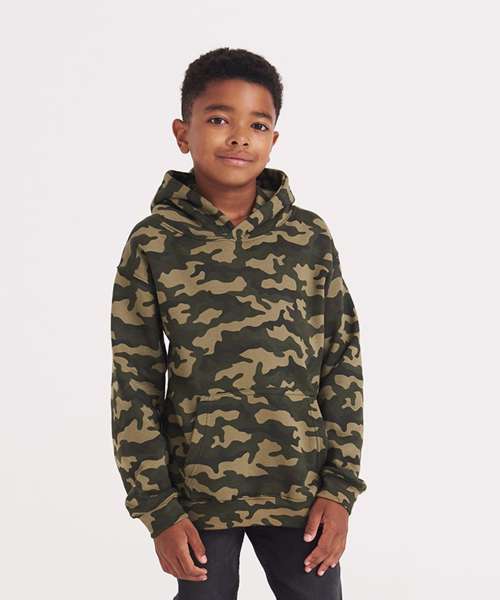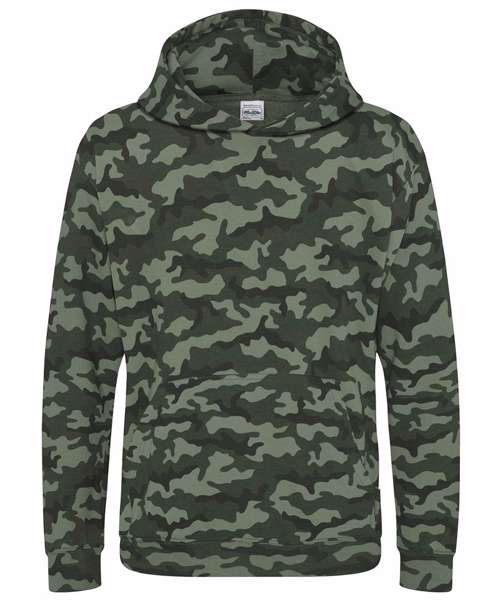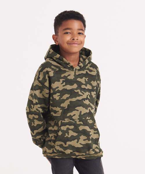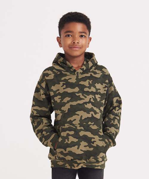Classic all-over camouflage print design. Double fabric hood. Twin-needle stitching detail. Kangaroo pouch pocket. No drawcords - to comply with EU regulations. Brushed inner fleece. Ribbed cuffs and hem. Soft-cotton faced fabric creates ideal printing surface. Simple tear-out label makes it perfect for rebranding.