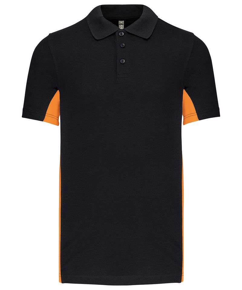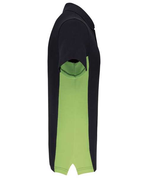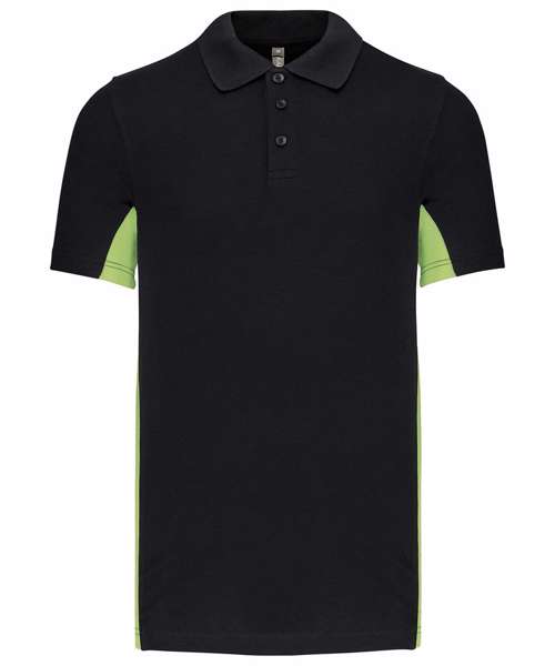 65% polyester/35% cotton. Piqué knit. Ribbed collar. 3-button matching placket. Contrast panels down arm and sides. Self-fabric cuffs. Certified STANDARD 100 by OEKO-TEX® N° CQ 1007/7, IFTH.