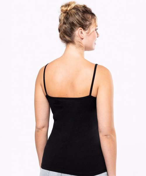 95% cotton / 5% elastane. Jersey knit fabric in combed cotton. Fine straps and feminine fit. Piping at the neckline and twin needle finish at hem. Certified STANDARD 100 by OEKO-TEX®N° CQ1007/7, IFTH.