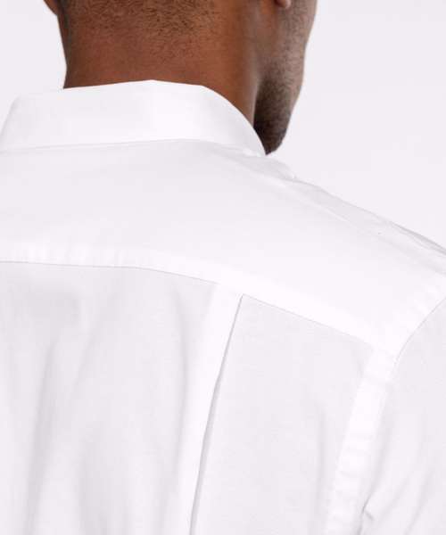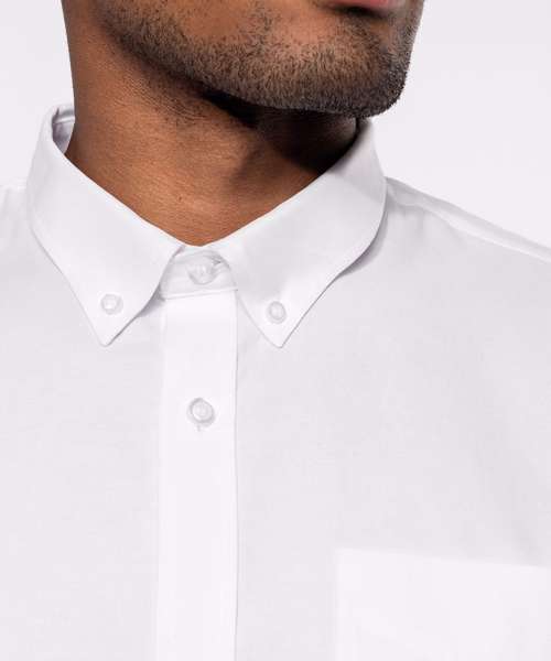 70% Oxford cotton/30% polyester. Easy-care fabric. Button down collar. Matching buttons. V-shaped left chest pocket. Double back yoke with 2 side pleats. Adjustable rounded button cuffs with button placket. 2 spare buttons. Shaped hem. Certified STANDARD 100 by OEKO-TEX® N° CQ 1007/7, IFTH.