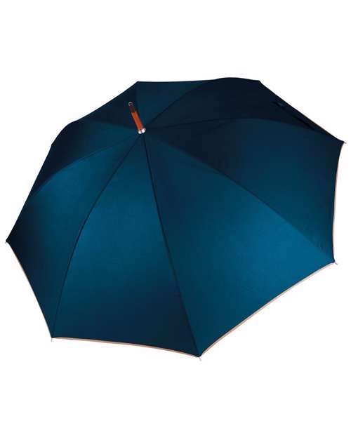 Classic wooden umbrella 23" (58.5 cm) auto opening, pongee solid fabric, black metal frame, wooden shaft, wooden J handle, white metal tips, 96 cm Ø. BSCI certified.