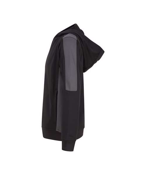 Unisex kids’ hoodie. Contrast sleeves and side panelling on contrast only. Ribbed cuffs and hem. Crossover hood neck at centre front. Zipped welt pocket in front panel side seam. Three-piece hood. Offered in contrast and solid colours. Tear-out label.