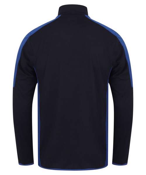 ¼ zip style with stand-up collar. Contrast colour/fabric panels at sides and sleeves. Reversed nylon coil zip with lock down zip slider. Contrast colour stretch binding at cuffs and hem, and concealed pocket in panel seam (right-hand-side as worn). Finden & Hales tear-out label for easy rebranding.
