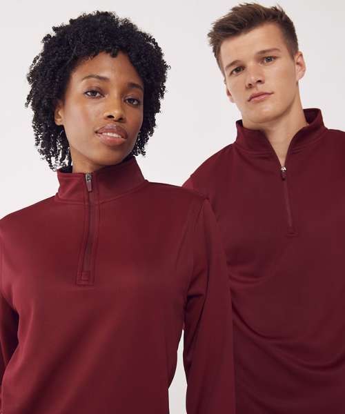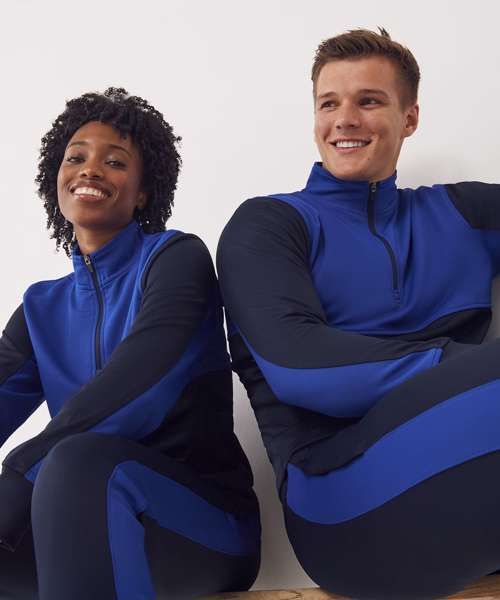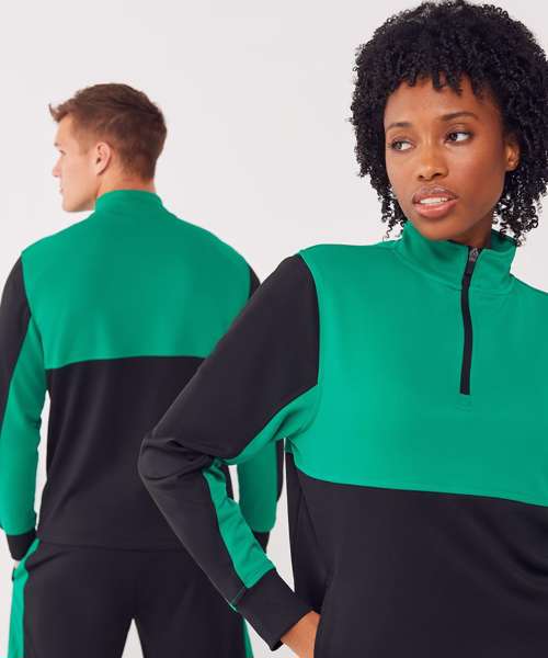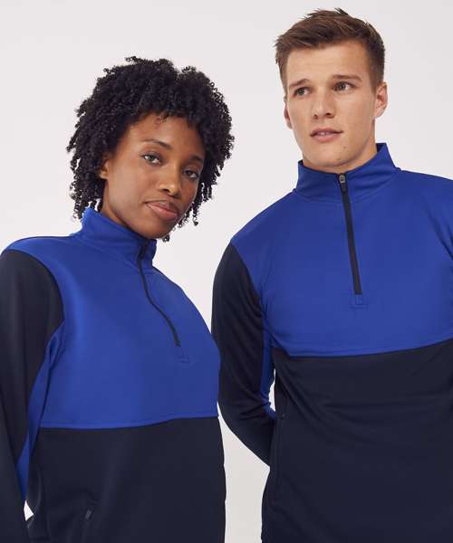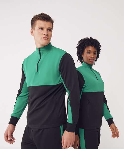 Contrast upper chest and underarm panels. Quarter zip. Side panels. Reverse nylon zips centre front and side pockets. 1x1 ribbed cuff sleeve. Semi-automatic zip pull and slider.