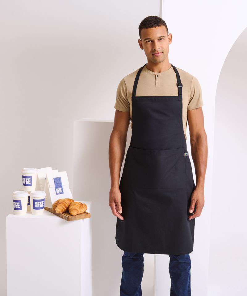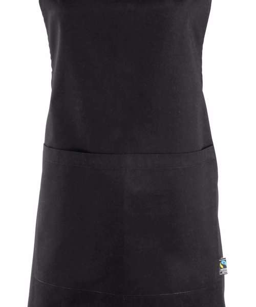 An adjustable pocket bib apron. This apron is made from 100% certified Fairtrade cotton. The apron is labelled with the official Fairtrade logo.
