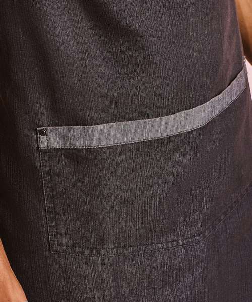 A quirky addition to the denim range, this bib apron gives an 'industrial-chic' feel to service with large gun metal eyelets securing the ties in place. The shade on the underside forms the contrast trim detail on the pocket and ties for a great reversible effect.