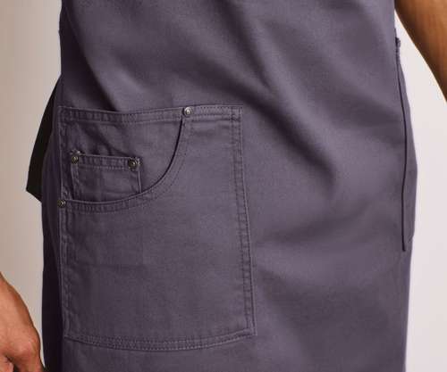 A full bib apron with style features taken from the popular 'chino' style. A stitched patch pocket with rivets features at the centre top and two side pockets big enough to carry tablet devices sit just below waist height. The neck strap is loose and the wearer can loop the end through the buckle and use the pop-snap buttons to fasten in place.