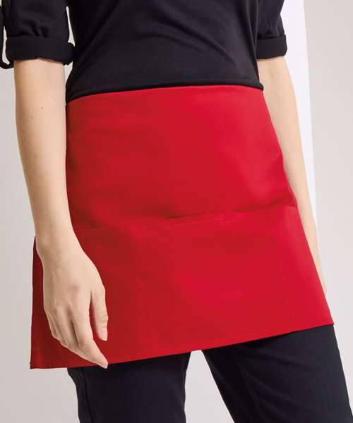 This 'Colours Collection' 2 in 1 apron allows the wearer choice and flexibility in how its worn. Initially a short bib apron, it doubles over and the neck ties button away to form a waist apron. Both styles have three functional pockets for carrying the tools of the trade.