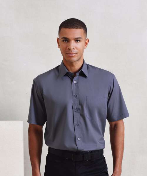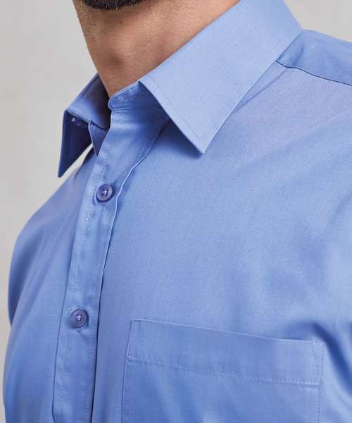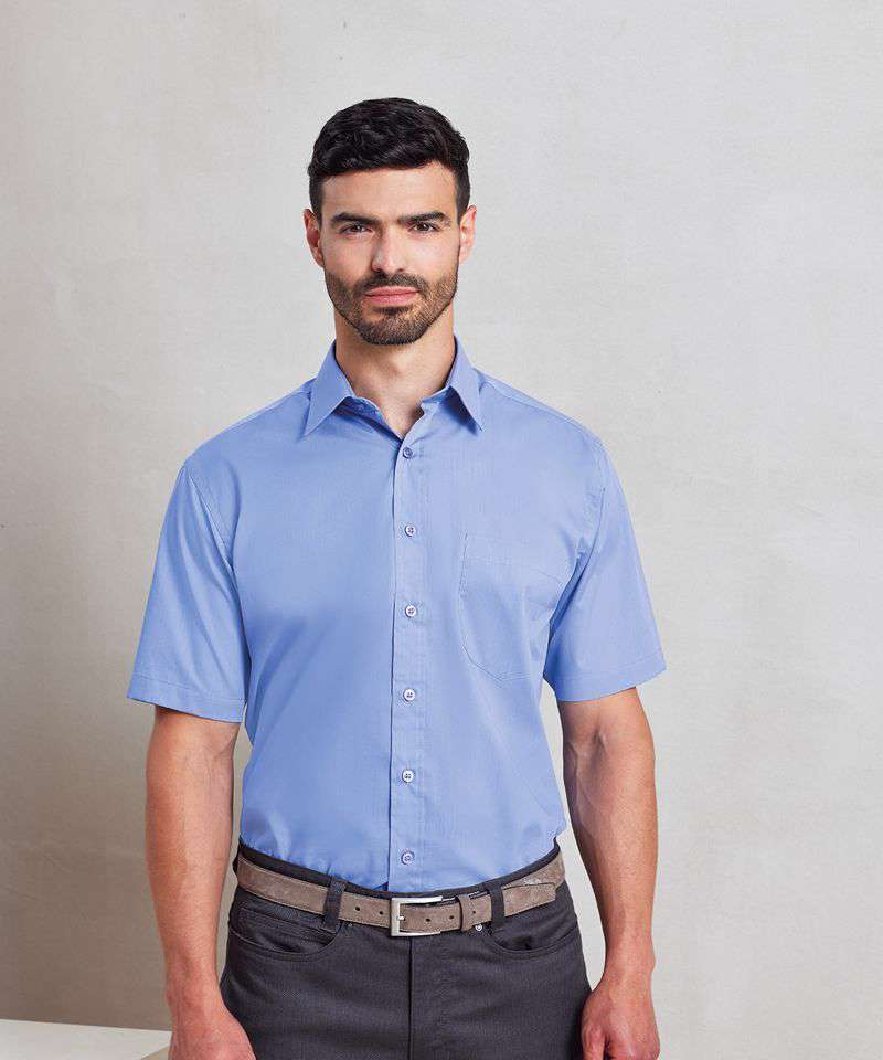 A short sleeved Poplin work shirt for men available in 30 colours from Premier's 'Colours Collection.' This classic fitting shirt has a stiffened formal cut collar that can accommodate a tie and the main body has a useful left breast pocket.