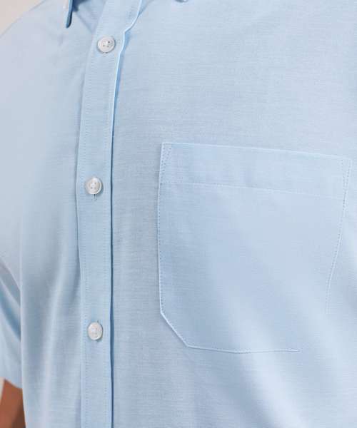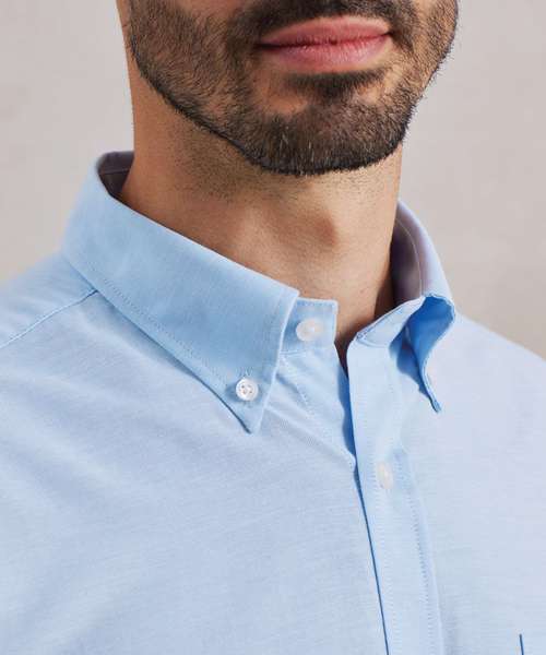 Men's signature Oxford short sleeve Easycare shirt with wrinkle free finish for a smart and professional appearance. Button down collar. Left breast open mitred pocket. Short sleeves. Back pleats. Cotton rich Oxford fabric. Semi fitted styling.