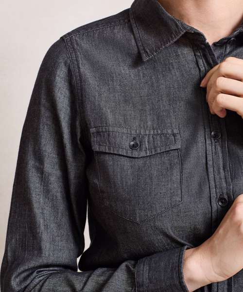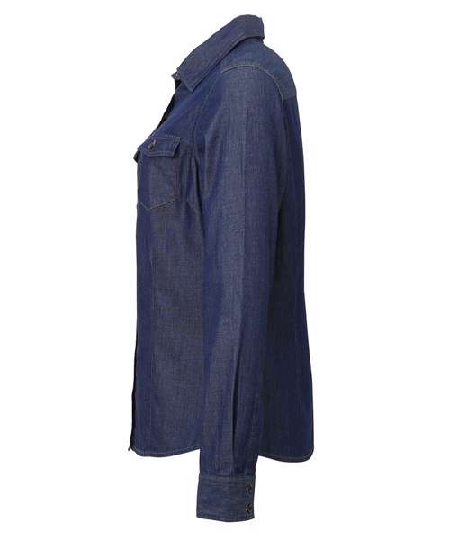 Long sleeve denim shirt with contrast stitch detail with two chest pockets. Buttoned cuff and sleeve guard. Curved hem. Back yoke.