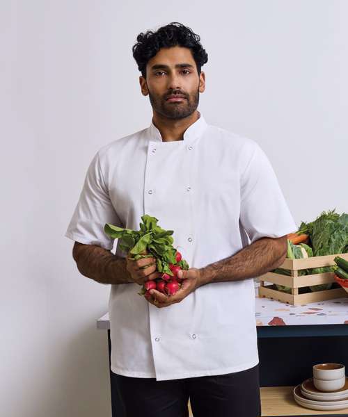 An easy-wearing short sleeve chef jacket with ten metal press studs in a popular wrap over style. Features a Mandarin Collar with topstitching and is available in Black or White.