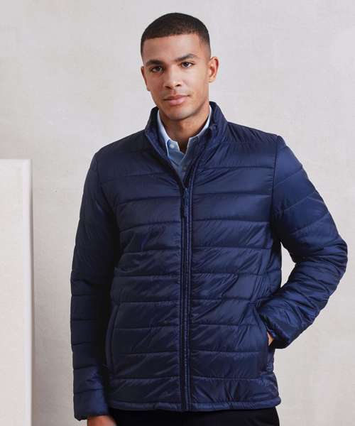 Men’s padded zip-through jacket with horizontal stitching to form baffles, ensuring an even distribution of insulation. Covered zip with chin guard and zip guard to the inner. Styled with a cadet collar. Two welt jet zipped side pockets with a single open pocket to the inner for handy storage. Elasticated cuffs measuring one inch wide. Full embroidery access to the entire jacket through an internal zip in the lining. Lightweight and folds downs easily into its own stuff sack. Made with 100% certified recycled fabrics.