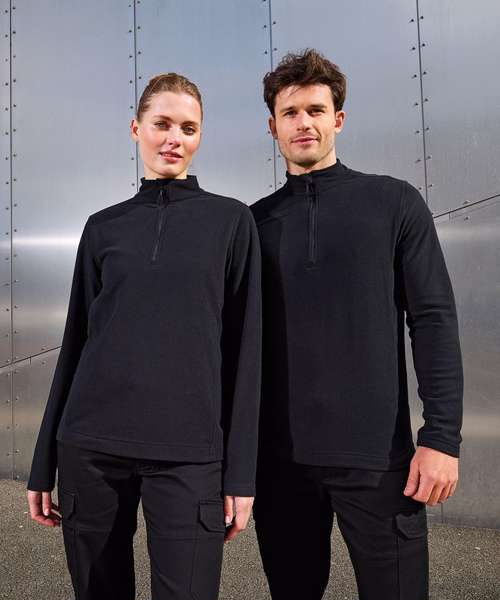 Unisex 1/4 zip microfleece. Anti-pill fabric prevents bobbling. Self-coloured zip pull. Chin guard and storm flap. Cadet collar. Side panels. Straight finished hem. Made from 100% certified recycled polyester.