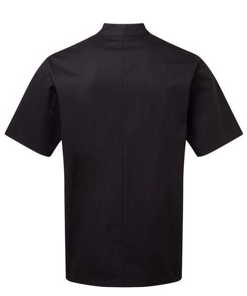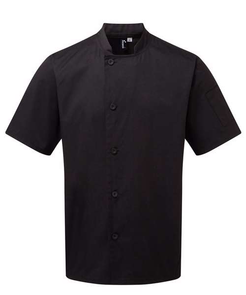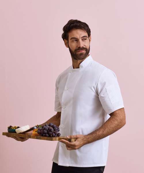 A durable short sleeve chef's jacket that fastens down the right hand side of the body with five long life resin buttons. On the left sleeve there is a handy double pocket pen compartment. This jacket is styled with a mandarin collar and is available in Black and White and offers great value for money.