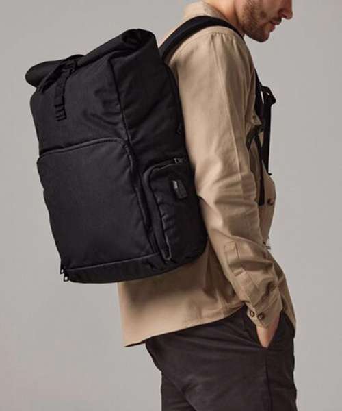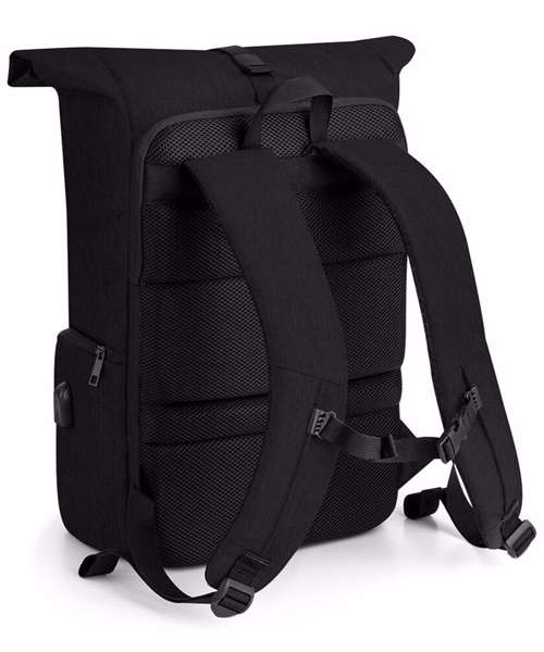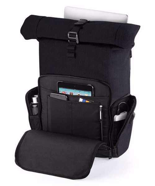 TearAway label for ease of rebranding. Laptop compatible up to 15.6". External access padded laptop compartment. Secure roll-top and clip closure system. Discrete zippered back panel pocket. Front pocket organiser section. Internal slip pocket. Multiple internal pockets. Power bank pocket. Integrated USB charging port. Zippered front pocket. Zippered side bottle pocket. Ergonomic padded back panel. Padded adjustable shoulder straps.