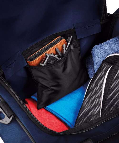 Detachable adjustable shoulder strap with pad. Shoe tunnel/wet pocket. Internal valuables pocket. Elasticated bottle loops. Zippered end pockets. Internal mesh pockets. Padded hand grip.