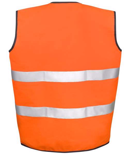 UKCA. EN ISO 20471:2013 + A1:2019 CLASS 2. Generous in size allowing to be worn as an over garment. Single, long, vertical tear release fastening. 50mm sewn on safety tapes incorporating 3M™ Scotchlite™ reflective materials. Grey polyester bound edges. For maximum effectiveness, should be worn fastened and kept clean. Decoration methods: Embroidery, transfer print, direct print.