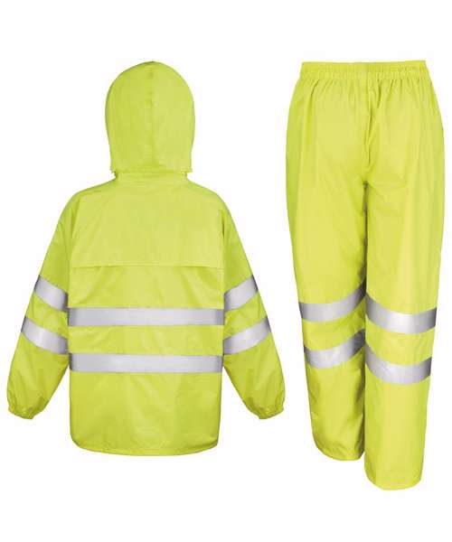 Waterproof 2000mm and windproof protection. Stowable bag. StormDri 2000 fabric. JACKET: Stud closing outer storm flap with heavy duty zip. Drawstring hem. Integral drawstring hood. Front pockets with stormflap. Elasticised cuff. Taped seams. Hangtag. Mesh-lined back vent. Reflective body bands. TROUSER: Side access pockets. Elasticised waist. Reflective leg bands. Taped seams. Decorating methods: Transfer print, direct print. Decorators access point: open.