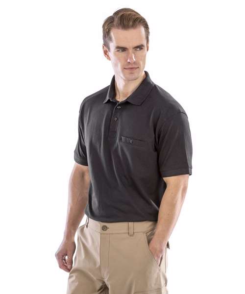 Overlocked polyfilm seams for shape retention. Double layer shoulder panels. Critical twin needle stitching. Locker patch for self brand. 3 button reinforced placket and side vents. Welt chest pocket with button fastening. Raised edge flat-knit rib collar and cuff. Drop sleeve. Spare button. Collar stand. Ready to brand – tag free. Easy to wash, tough and hardwearing. Soft piquet knit.