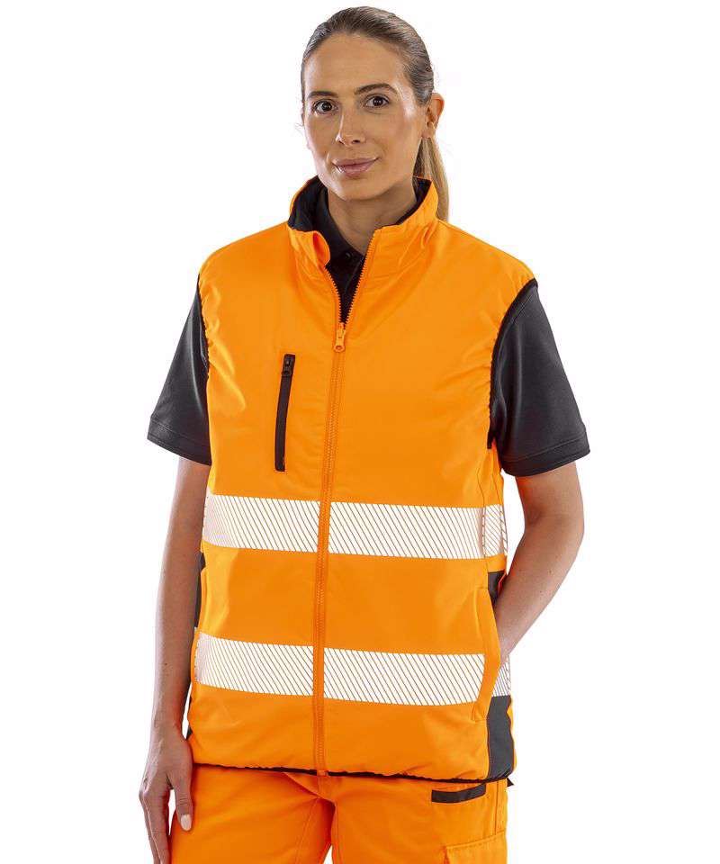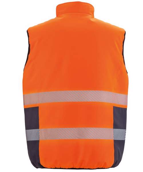 EN ISO 20471:2013+A1:2016 CLASS 2; RIS-3279-TOM (ORANGE ONLY). Lightweight and warm. Soft stretch. Printable. High visibility. Reflective safety body bands. Hang tag. Dark lower panel masks grime. Soft bound cuff. Stand-up collar. Quiet to wear. Zipped pockets. Ready to brand tag free. Decorating methods: Embroidery. Decorators access point: Hidden chest and back zips on navy side.