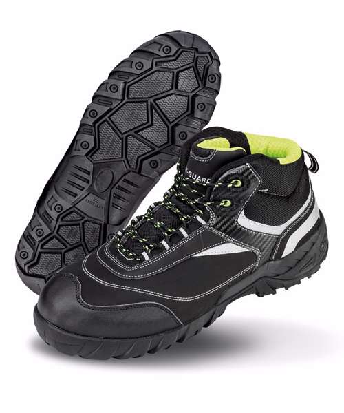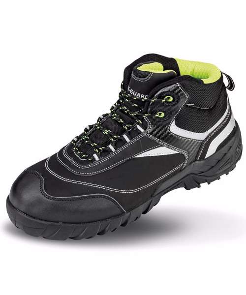 Composite midsole for underfoot protection. Padded ankle cuff and tongue. Energy absorption heel. SRC slip resistance. Bottle green trim. Reflective detail. Anti-static. Scuff cap. Loop pull. Zero rated VAT. Tough and hardwearing. Lightweight ankle protection. EN 20345:2011 S3 SRC.