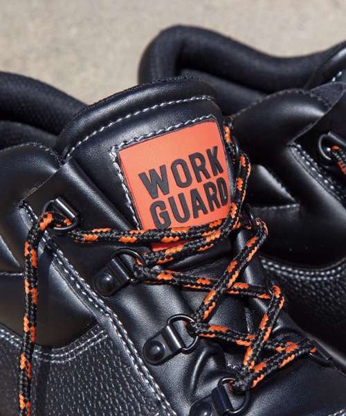 SBP safety boot. Steel toe cap and steel midsole. Eyelets: Black with a sheen. Laces: all Orange + spare sets in Orange/Black and all Black. Upper: Black embossed split leather upper. Ankle internal: Inside lining, mesh black. Toe: EVA black toe. Sole: Duel density Black/Orange PU sole. Collar: Process black padded collar. EN 20345:2011 S1P SRA.