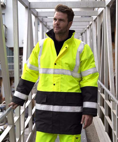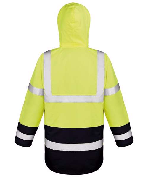 50mm reflective shoulder, body, and sleeve safety bands. Storm flap covered large pockets. Adjustable foldaway hood. Stud closing stormflap. Diamond quilted lining. Heavy-duty 2-way zip. Fully taped seams. Stand-up collar. Inside pocket. Dark lower panel masks grime. Ready to brand - tag free. EN ISO 20471:2013+A1-2016 - Class 3. RIS-3279-TOM - Class 3 (Orange only).