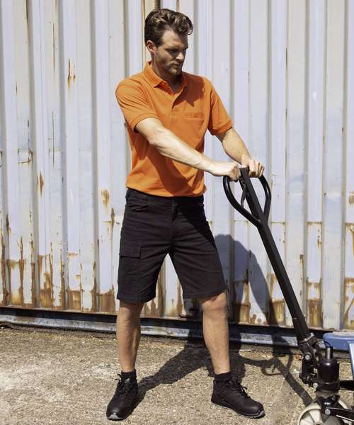 Peach finish slim-fit stretch chino shorts. Rear, hip and cargo pockets. YKK zip with button fastening. Critical bar tack. Twin-needle seams. Expansion waistband for adjustable fit and draught protection. Hardwearing finish.