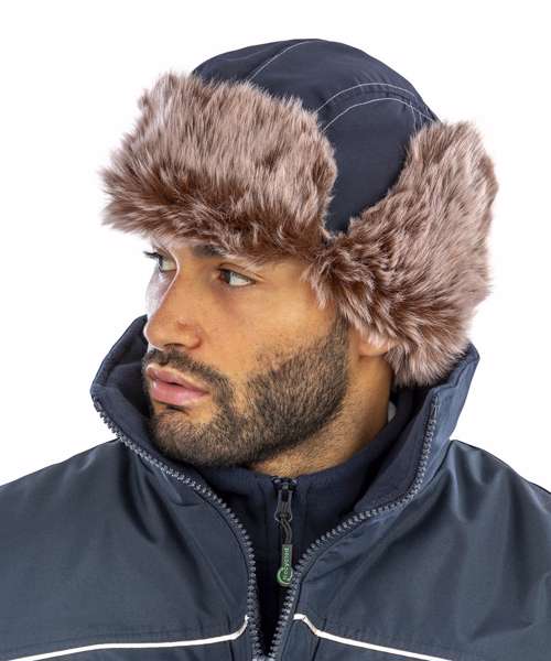Soft peach finish. Faux fur trim - 80% acrylic, 20% polyester. Showerproof. Quick drying. Snap close fastening. Mesh eyelets for sound allowance. Suitable for embroidery and print. Decorating Guidelines: Decorating methods: Embroidery & Transfer print Decorators access point: Open.