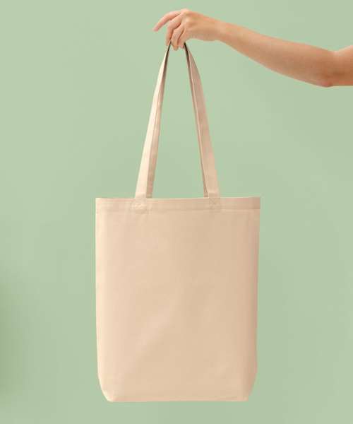 A large capacity bag with a bottom gusset, it weighs 280gsm and is made with recycled cotton. It is made to be carried over the shoulder or by hand with 70 x 2.5cm handles.
