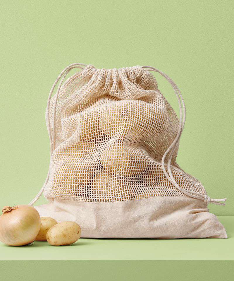 100% Recycled cotton. Rope drawcord closure. Mesh main body. Cotton panel for easy decoration. Multipurpose use. One size. Food safe.