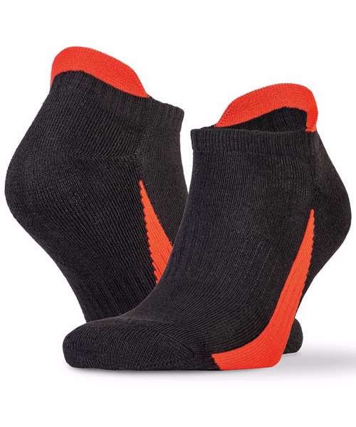 Co-ordinated with Spiro teamwear. Cushioned comfort: stategic double-layer cushion impact. Secure fit: ribbed instep reduced movement & risk of blisters. Rib cuff and instep. Contrast colour trim. Low cut sports fit with ankle tab.