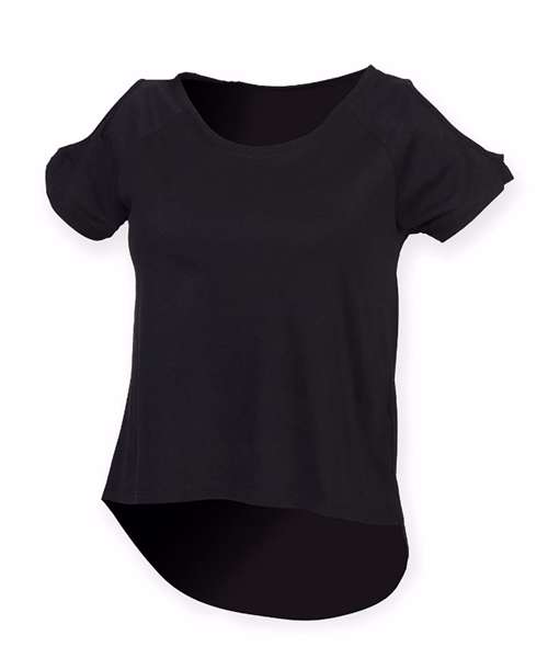 Give boring t-shirts the cold shoulder. This relaxed fit t-shirt is a cool alternative for the fashion-conscious, with short raglan sleeves, cut-out shoulders and curved drop tail hem. Tear-out label for easy rebranding.