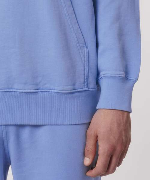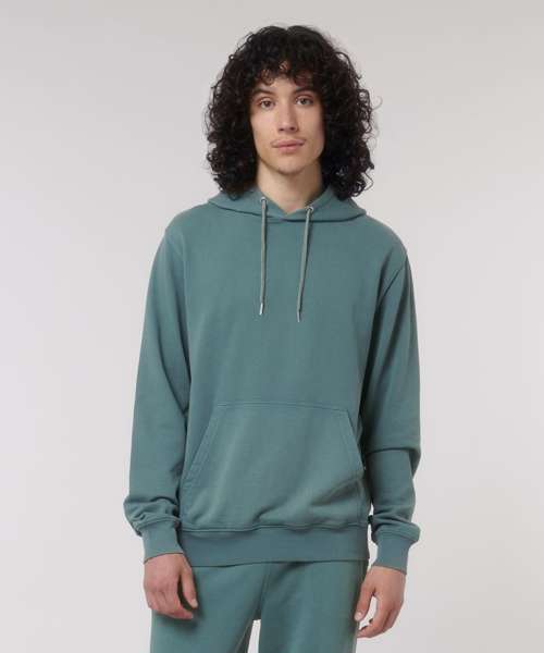 Unisex medium fit garment dyed hoodie sweatshirt. Set-in sleeve. Double-layered hood in self- fabric. Round drawcords in matching body colour with closed metal tipping. Metal eyelets. Inside herringbone back neck tape. Self-fabric half-moon at back neck. 1x1 rib at sleeve hem and bottom hem. Armhole, sleeve hem and bottom hem with twin-needle topstitch. Kangaroo pocket at front. Slight shading on seams to give washed look. Garment-dyed product: each garment may vary in appearance, colour may bleed, follow our care label. Read carefully print recommendations.