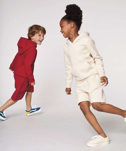 Kids jogger shorts. Self-fabric elastic waistband and round drawcords in matching body colour with metal tipping. Embroidered eyelets. Pockets at front. Patch pocket at back. Bottom hem with wide double-needle topstitch.