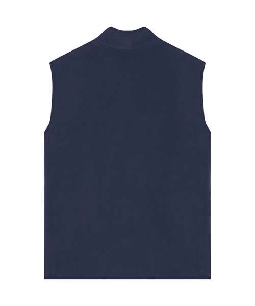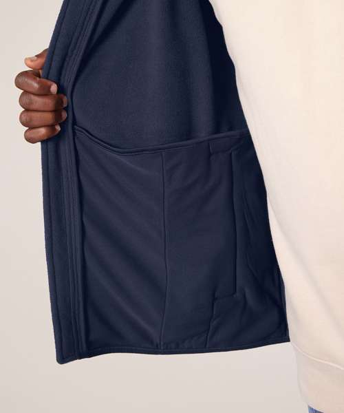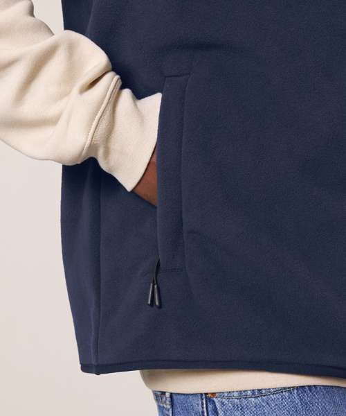 Sleeveless. Elastic binding at neck edge, armhole and hem. Inside back neck grosgrain loop. Nylon coil zip with metal zip pull and cord ending. Brushed fabric with anti-pilling finish on the inside and outside. Front side welt pockets with zip opening. Inside back neck tape in recycled polyester.