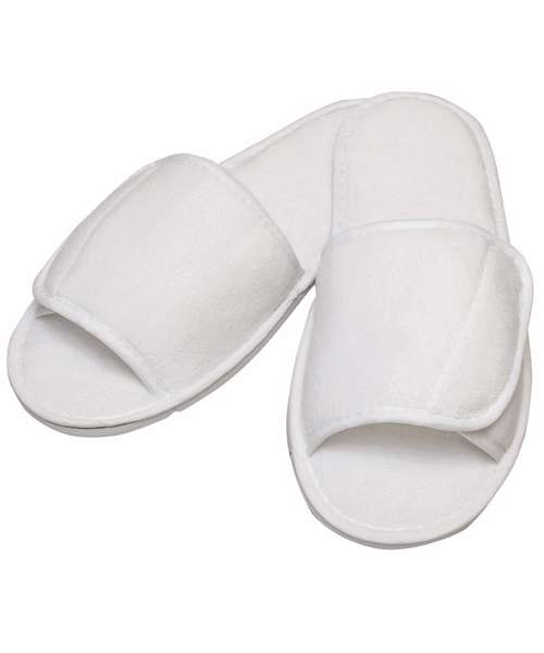 Step out in comfort with the open toe slippers with side fastening. Made with convenient adjustable hook and loop fastening and comfortable padded sole. The front panel provides the perfect opportunity for embroidery and sublimation printing for a logo or design.