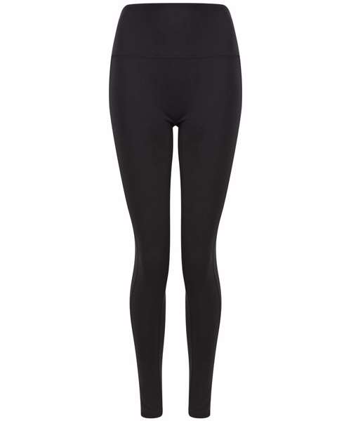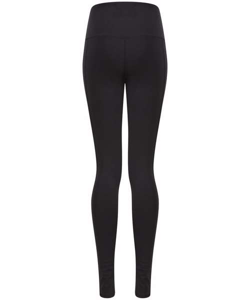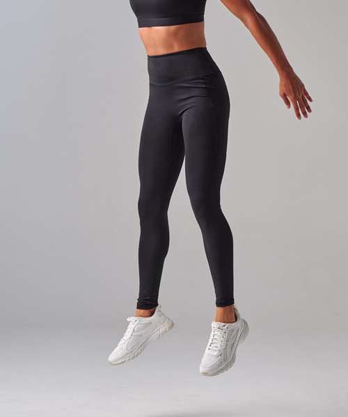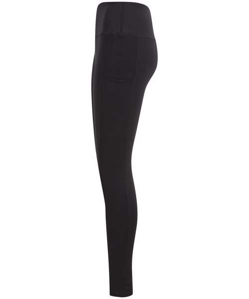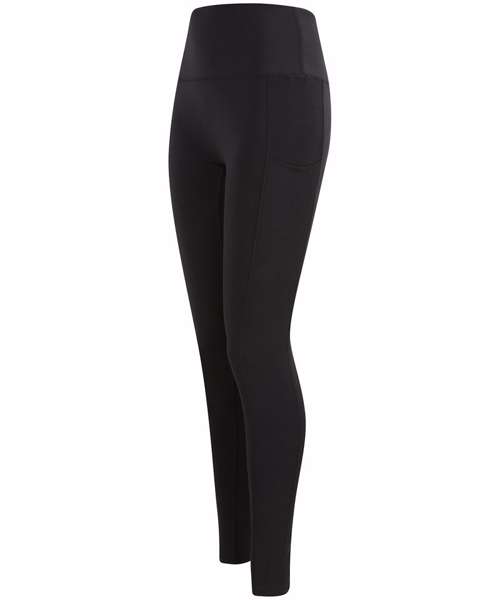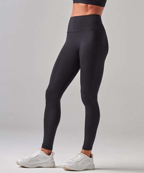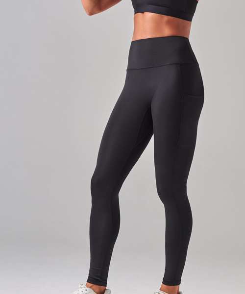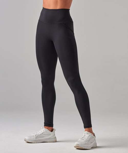 Women's core leggings with high waist and deep waistband. Phone pocket in side panel on left side. Tear-out label.