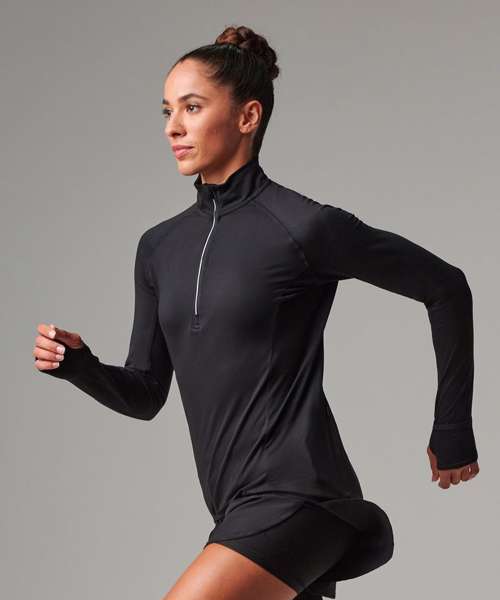 Train smarter in our ultimate 1/4 zip. Reflective zip tape and dot design on the reverse ensures maximum visibility, while the sports thumbholes and discreet fold over cuffs are perfect for when the temperature drops. The single Jersey fabric with wicking finish keeps you cool and dry, helping you to perform at your best.